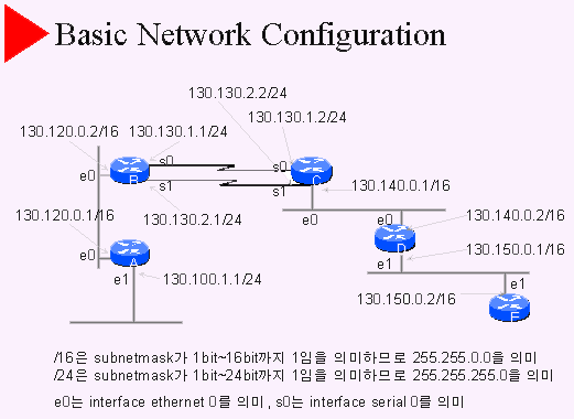 - 130.120.0.1/16이라는 것은 interface의 IP Address로 130.120.0.1을 가지며 subnetmask는 255.255.0.0을 갖는다는 것을 의미한다. 130.120.0.1은 Class B IP Address이고 Class B IP Address는 기본적으로 netmask 255.255.0.0을 가지므로, 130.120.0.0은 subnetting되지 않았다는 사실을 알수 있다.
