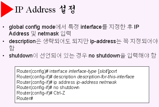 - interface이름은 interface 형태와 몇번째 slot의 몇번째 port에 속하는 것인가를 표시하여 지정한다. 즉 어떤 serial interface가 2번째 slot의 3번째 port에 위치해 있다면 그것은 serial 1/2로 표시된다. 숫자가 1씩 적은 이유은 0에서부터 시작하기 때문이다. serial interface를 위한 serial slot이 1개 밖에 없다면 serial 2로 간단히 표시되기도 한다.