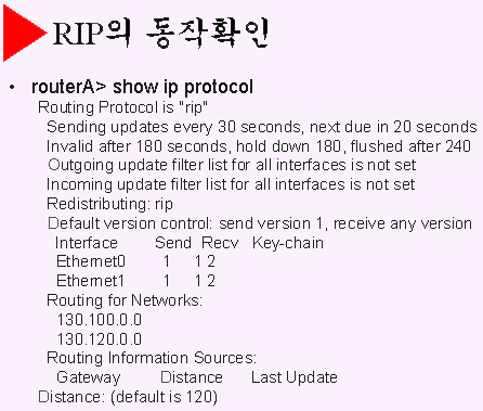 - RIP을 이용하는 네트웍에서 subnetwork number가 불연속적으로 할당되는 것은 피해야 한다. 즉 130.130.3.0/24를 라우터D와 라우터E의 interface ethernet1에 대한 network number로 할당하지 않아야 한다.