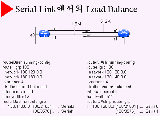 - 만약 routerB의 interface serial 0에 대한 bandwidth만 512로 지정하였다면 130.140.0.0에 대한 route는 serial 1으로 1개만 나타날 것이다. 왜냐하면 cost가 작은 route만 routing table에 등록되기 때문이다. 그러나 variance를 선언함으로써 cost가 더 많은 route도 routing table에 등록되게 할 수 있다. variance는 이러한 cost의몇배수범위에 있는 route도 등록할 것인지를 지정하는 명령어이다. 선언하지 않으면 즉 default로는 1이다.