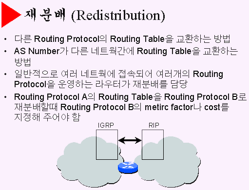 - igrp간의 재분배시에는 metric factor를 선언해 주지 않아도 된다.