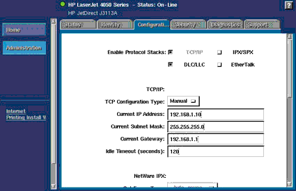 HP JetDirect À¥Åø(Webtool) HP JetDirect À¥ÅøÀº 6 °³ÀÇ ¸Þ´ºÅÇ(¸Ç À§¿¡ ÀÖÀ½)À» °®°í ÀÖ´Ù. 1. Status Tab ÇöÀçÀÇ ÇÁ¸°ÅÍ »óÅ ¹× ³×Æ®¿öÅ© »óŸ¦ Ç¥½ÃÇÑ´Ù. 2. Identity ÇöÀçÀÇ ¼ÒÇÁÆ®¿þ¾î, Çϵå¿þ¾î ¹öÀü ¹× È£½ºÆ®³×ÀÓ, IP ÁÖ¼Ò¸¦ º¸¿© ÁØ´Ù. 3. Configuration TCP/IP (µðÆúÆ® protocol), IPX/SPX, DLC/LLC, Ethertalk, SNMP ±¸¼ºÀ» ÁöÁ¤ÇÑ´Ù.. 4. Security °ü¸®ÀÚ ÆÐ½º¿öµå ¹× SNMP community name ±¸¼ºÀ» ÁöÁ¤ÇÑ´Ù. 5. Diagnostics TCP/IP, IPX/SPX, DLC/LLC, Ethertalk, ÇÁ¸°ÅÍ, Jetdirect ÀÇ Á¤º¸ ¹× Åë°è¸¦ º¸¿© ÁØ´Ù. 6. Support HP Áö¿ø À¥»çÀÌÆ®·Î ¾È³»ÇÑ´Ù. ¸®´ª½º¿¡¼ JetDirect·Î ÀμâÇϱ⠸®´ª½º¿¡¼ Jetdirect ÇÁ¸°Åͼ¹ö·Î ÀμâÇϱâ À§Çؼ´Â /etc/printcap ÆÄÀÏÀ» ¼öÁ¤ÇØ¾ß ÇÑ´Ù. ³ª´Â »õ·Î¿î /usr/spool/lj4050n À̶ó´Â spool µð·ºÅ丮¸¦ ¸¸µé¾ú´Ù. ±×·¯³ª ±âÁ¸ÀÇ /usr/spool/lpd µð·ºÅ丮µµ »ç¿ëÇÒ ¼ö ÀÖ´Ù. /usr/spool Àº /var/spool µð·ºÅ丮ÀÇ ¼ÒÇÁÆ®¸µÅ©ÀÌ´Ù. ¾Æ·¡´Â HP JetDirect ÇÁ¸°ÅÍ ¼¹ö¸¦ À§ÇÑ /etc/print-cap