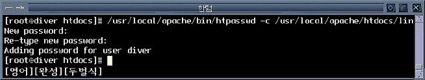ÀÌ·¸°Ô Ãß°¡ ÇØÁÖ°í ./linux(¹°·Ð ÇÊÀÚ°¡ ÀÓÀÇ·Î ¸¸µç)µð·ºÅ丮¿¡ ÆÐ½º¿öµå¸¦ ¼³Á¤ ÇØÁØ´Ù. #/usr/local/apache/bin/htpasswd -c /usr/local/apache/htdocs/linux/.htpasswd