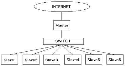 2. Topology(À§»ó) ¾ÆÅèÀº ±×¸²°ú °°ÀÌ ÇÑ °³ÀÇ ¸¶½ºÅͳëµå¿Í 6°³ÀÇ ½½·¹À̺ê³ëµåÇØ¼ ÃÑ 7°³ÀÇ ³ëµå·Î ±¸¼º µÇÀÖÀ¸¸ç °¢ ³ëµå°¡ dual cpu À̹ǷΠÃÑ 14°³ÀÇ ÇÁ·Î¼¼¼¸¦ °¡Áö°í ÀÖ´Ù. ¼ºê ³×Æ®¿öÅ©¸¦ ±¸ÃàÇÏ´Â °ÍÀº ¿ÜºÎÀÇ ÆÐŶÀÌ °¢ ³ëµå°£ÀÇ Åë½Å¿¡ ¿µÇâÀ» ¹ÌÄ¡Áö ¸øÇÏ°Ô ÇÔÀ¸·Î½á ³ëµå°£ÀÇ Åë½Å¼º´ÉÀÌ Çâ»óµÇ´Â ÀåÁ¡ÀÌ ÀÖÀ¸¸ç ¿ø°Ý»ç¿ëÀÚÀÇ Á¢±ÙÀ» ÇÑ °÷À¸·Î Á¦ÇÑÇÔÀ¸·Î½á ÀϰýÀûÀÎ °ü¸®°¡ °¡´ÉÇÏ´Ù.