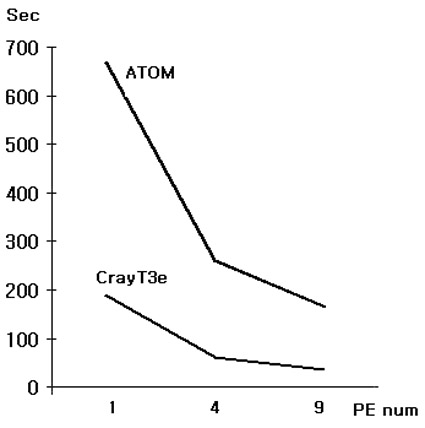 + User PE(128) 2°³ÀÇ ÇÁ·Î±×·¥À» »ç¿ëÇÏ¿© Å×½ºÆ®¸¦ Çߴµ¥, Çϳª´Â Á÷Á¢ ÀÛ¼ºÇÑ ÀÛÀº ÇÁ·Î±×·¥À̸ç ÀÛÀº ¸Þ½ÃÁö¸¦ ¹ß»ý½ÃŰ´Â ÇÁ·Î±×·¥ÀÌ´Ù. 4°³ÀÇ ÇÁ·Î¼¼¼¸¦ »ç¿ëÇÏ¿© Å×½ºÆ®ÇÑ °á°ú´Â CrayT3e¿¡¼´Â 69Ãʸ¸¿¡ ´äÀ» ¾ò¾úÀ¸¸ç, ATOM Cluster¿¡¼´Â 131Ãʸ¸¿¡ ´äÀ» ¾ò¾ú´Ù. ½´ÆÛÄÄÇ»ÅÍ¿¡ ºñÇØ ¾à 50%ÀÇ ¼º´ÉÀ» ³»°í ÀÖ´Ù. »ç½Ç ÀÌ Å×½ºÆ®´Â ATOM¿¡°Ô ¸Å¿ì À¯¸®ÇÑ Å×½ºÆ®ÀÌ´Ù. ÀϹÝÀûÀ¸·Î AlphaĨÀº µ¿ÀÏ Å¬·°ÀÇ Intel¿¡ ºñÇØ 2.5¹èÁ¤µµÀÇ ºü¸¥ ¼º´ÉÀ» °®°í ÀÖÁö¸¸ integer³ª 32bit floating ¿¡¼´Â 64bitÀÇ ÀåÁ¡À» ÃæºÐÈ÷ »ì¸®Áö ¸øÇÑ´Ù. ¶ÇÇÑ Crayt3eÀÇ ÀåÁ¡ÀÎ °í¼Ó ³×Æ®¿öÅ©µµ ÀÛÀº Åë½ÅÀÌ ÇÊ¿äÇÑ È¯°æÀ̹ǷΠũ°Ô À¯¸®ÇÏ°Ô ÀÛ¿ëÇÏÁö ¸øÇß´Ù.