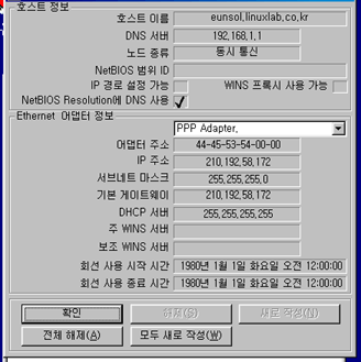 1.4 ¿¬°á ÀÌÁ¦ ¸ðµç ¼³Á¤Àº ³¡³µ´Ù. À©µµ¿ì¿¡¼ ÀüÈÁ¢¼Ó ³×Æ®¿öÅ·À» ¼³Á¤Çϰí pap-secrets ÆÄÀÏ¿¡ ÁöÁ¤ÇÑ °èÁ¤(hansol)°ú ¾ÏÈ£(pass)¸¦ ³Ö°í ¿¬°áÀ» ´©¸£¸é ÀüȰ¡ ¿¬°áµÇ°í "»ç¿ëÀÚ È®ÀÎ Áß " ¸Þ½ÃÁö¿¡ À̾î "³×Æ®¿öÅ©¿¡ ·Î±×ÀÎ Áß .." ÀÌ·± ¸Þ½ÃÁö°¡ ³ª¿Ã °ÍÀÌ´Ù. ´ÙÀ½ ¿¬°áÀÌ ¿Ï·áµÇ¸é ÀüÈÁ¢¼Ó ³×Æ®¿öÅ© âÀÌ »ç¶óÁö°í ´Ù¸¥ âÀÌ ³ª¿Â´Ù. À©µµ¿ìÀÇ ½ÇÇà ¸í·É¿¡¼ winipcfg ¸í·ÉÀ» ÁÖ¸é À©µµ¿ì¿¡ ºÎ¿©µÈ ÁÖ¼Ò°¡ ³ª¿Â´Ù. ¾Æ·¡¿Í °°´Ù. <±×¸² 2>