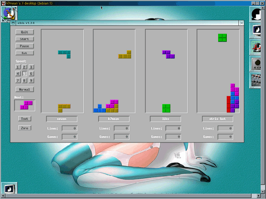 Á¦ÀÏ Ã³À½À¸·Î °ÔÀÓÀ» ½ÃÀÛÇÏ´Â »ç¶÷Àº ¡®xtris -n <»ç¿ëÇÒ ´Ð³×ÀÓ>¡¯ À¸·Î ¡®xtris¡¯¸¦ ½ÇÇàÇÏ°í ±× ´ÙÀ½ºÎÅÍ´Â ¡®xtris -n <»ç¿ëÇÒ ´Ð³×ÀÓ> <Á¢¼ÓÇÒ ¼¹öÀ̸§>¡¯À» ŸÀÌÇÎÇÑ´Ù. ¿©±â¿¡¼ ¡®<Á¢¼ÓÇÒ ¼¹öÀ̸§>¡¯Àº ¡®localhost¡¯·Î Àû¾îÁÖ¸é µÈ´Ù. ¡®xtris¡¯°¡ ½ÇÇàµÇ°í ÀÖ´Â ´Ù¸¥ ÄÄÇ»ÅÍÀÇ IP address³ª µµ¸ÞÀγ×ÀÓÀ» ÀÔ·ÂÇÏ¿©µµ »ó°ü¾ø´Ù. »ç¶÷µéÀÌ ¡®xtris¡¯¼¹ö¿¡ Çϳª¾¿ Á¢¼ÓÇÏ°Ô µÇ¸é »õ·Î¿î Åׯ®¸®½ºÃ¢ÀÌ Ãß°¡µÈ´Ù.¸ðµÎ°¡ Á¢¼ÓÇÏ¿´À¸¸é ¿ÞÂÊ ÇÏ´ÜÀÇ ½ºÅ¸Æ®¹öưÀ» ¾Æ¹«³ª Ŭ¸¯Çϸé Áñ°Å¿î °ÔÀÓÀÌ ½ÃÀ۵ȴÙ. ÇÊÀÚ °°Àº °æ¿ì´Â ÁÖ·Î 10½Â¸ÕÀú Çϱ⠰°Àº À½·á¼ö ³»±â °ÔÀÓÀ» Áñ±ä´Ù. ^_^; < À©µµ¿ì¿ë ¡®vncviewer¡¯·Î xtris¸¦!>