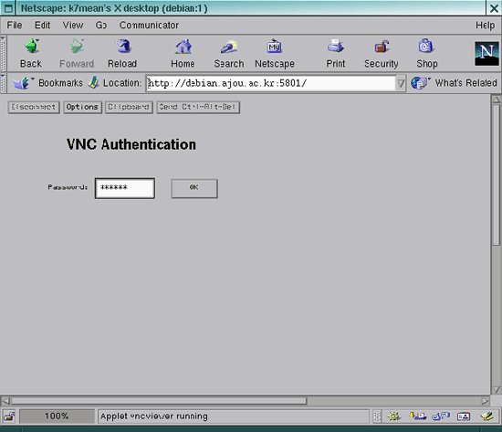 ÆÐ½º¿öµå·Î±×ÀÎ °úÁ¤ÀÌ ³¡³ª¸é ¡®vncviewer¡¯¿¡ ºñÇØ ÈÁúÀº ¶³¾îÁöÁö¸¸ Á¦´ë·Î ÀÛµ¿µÇ´Â ÀÚ½ÅÀÇ ¿¢½º À©µµ¿ì µ¥½ºÅ©Å¾ ȸéÀ» º¼ ¼ö ÀÖÀ» °ÍÀÌ´Ù. ÀÚ¹Ù ¾ÖÇø´À¸·Î ±¸ÇöµÇ¾î Á³°í À¥ ºê¶ó¿ìÀú »ó¿¡¼ µ¿ÀÛÇϱ⠶§¹®¿¡ ´À¸° °¨ÀÌ ¾øÁö´Â ¾ÊÁö¸¸ °£´ÜÇÑ ÀÛ¾÷Àº ÃæºÐÈ÷ ÇÒ ¼ö ÀÖ´Ù. Á»´õ ¹Ì·ÁÇÑ È¸éÀ» ¿øÇÑ´Ù¸é ¡®vncviewer¡¯¸¦ »ç¿ëÇÏ¸é µÉ °ÍÀÌ´Ù. <ÆÐ½º¿öµå ÀÎÁõ°úÁ¤>