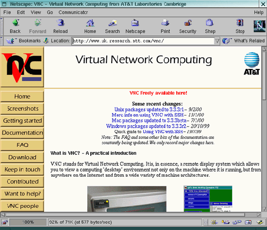VNC¸¦ ±¸ÇÒ ¼ö ÀÖ´Â °÷Àº? VNCÀÇ °ø½Ä ȨÆäÀÌÁö´Â ¡®http://www.uk.research.att.com/vnc/¡¯ ÀÌ´Ù. ÀÌ È¨ÆäÀÌÁö¿¡¼ VNC¿¡ °ü·ÃµÈ °¢Á¾ ¹®¼µéÀ» ±¸ÇÒ ¼ö ÀÖ´Ù. VNC¸¦ ´Ù¿î·Îµå ¹ÞÀ¸·Á¸é ´ÙÀ½ÀÇ URL¿¡¼ (¡®http://www.uk.research.att.com/vnc/download.html¡¯) °£´ÜÇÑ »ç¿ëÀÚ µî·ÏÆûÀ» ÀÛ¼ºÇϰí Àڽſ¡°Ô ÇÊ¿äÇÑ VNC¹öÁ¯À» ¼±ÅÃÇÏ¸é µÈ´Ù.( x86 win32 ¹öÀü°ú x86 linux ¹öÀüÀ» ¼±ÅÃÇϵµ·Ï ÇÏÀÚ.)