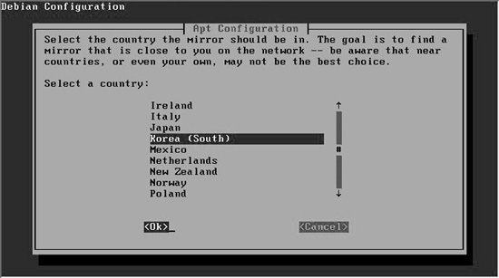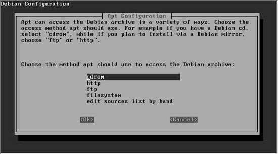 PPP ¼³Á¤±îÁö ³¡³ª¸é Apt¸¦ ÀÌ¿ëÇÏ¿© ÆÐŰÁö¸¦ ¼³Ä¡ÇÒ ¼ö ÀÖ´Â °æ·Î¿¡ ´ëÇØ ³ª¿Â´Ù. CD·Î ¼³Ä¡ÇÏ´Â »ç¿ëÀÚ¶ó¸é [cdrom]À» ¼±ÅÃÇϰí, ³×Æ®¿öÅ©·Î ¼³Ä¡ÇÏ·Á¸é [http]¸¦ ¼±ÅÃÇϵµ·Ï ÇÑ´Ù. ¸ÕÀú [cdrom]À» ¼±ÅÃÇÑ °æ¿ì ¾Æ·¡¿Í °°ÀÌ ³ª¿Â´Ù.