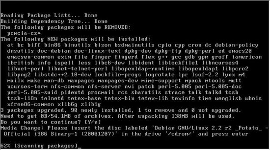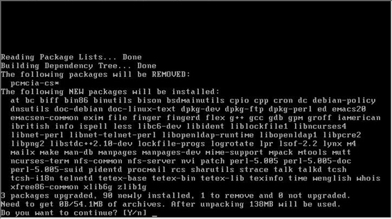 ȸé»ó¿¡¼ º¸ÀÌ´Â °ÍÀ» º¸¸é pcmcia-cs ¶ó´Â ÆÐŰÁö´Â Á¦°ÅµÇ°í, at, bc µîµî 90°³ÀÇ ÆÐŰÁö¸¦ »õ·Î ¼³Ä¡ÇÏ´Â °ÍÀ» ¾Ë ¼ö ÀÖ´Ù. ¶ÇÇÑ, ¼³Ä¡¿ë·®Àº 54.1MBÀÌ¸ç ¾ÐÃàÀ» ÇØÁ¦Çϸé 138MB°¡ µÇ´Â °ÍÀ» ¾Ë ¼ö ÀÖ´Ù. ¿£ÅÍ Å°¸¦ Ä¡¸é ¹Ù·Î ¼³Ä¡°¡ ½ÃÀ۵ȴÙ. ±×·¯¸é ¾Æ·¡¿Í °°Àº ȸéÀÌ ³ª¿Â´Ù.