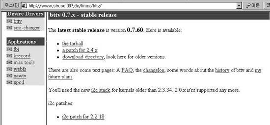 (2) ºñµð¿À ¹× »ç¿îµå ÀåÄ¡ µå¶óÀ̹ö ¼³Ä¡ 1) Ä¿³Î ÆÐÄ¡ ºñµð¿À¼¹ö¸¦ ¸¸µé±â À§ÇØ Ä¸Ãĺ¸µå ¹× »ç¿îµåÄ«µå µå¶óÀ̹ö¸¦ Ãß°¡Çϱâ À§Çؼ´Â ·¹µåÇÞÀ̳ª µ¥ºñ¾È¿¡ µé¾î ÀÖ´Â Ä¿³Î ¸ðµâ¸¸À¸·Îµµ °¡´ÉÇÏ´Ù. ÇÏÁö¸¸ bt848/878 ĸÃ帵å¿ë bttv µå¶óÀ̹ö´Â °è¼ÓÇØ¼ ¾÷µ¥ÀÌÆ® µÇ°í ÀÖÀ¸¹Ç·Î Ãֽеå¶óÀ̹ö¸¦ »ç¿ëÇØ¾ß È¸é »óŰ¡ ÁÁ´Ù. ±×·¡¼ ÇÊÈ÷ Ä¿³ÎÀ» ÄÄÆÄÀÏÇØ »ç¿ëÇϱ⸦ ±ÇÇÑ´Ù. ºñµð¿À ĸÃĺ¸µå µå¶óÀ̹ö¸¦ ¼³Ä¡Çϱâ À§Çؼ´Â ¸ÕÀú i2c( I square c ¶ó ¹ßÀ½ÇÑ´Ù.) µå¶óÀ̹ö¸¦ Ä¿³Î¿¡ Ãß°¡ÇØ¾ß ÇÑ´Ù.(¸ðµç ºñµð¿À ĸÃĺ¸µå¿¡ ÇØ´çµÈ´Ù.) 2.4¿¡´Â ÀÌ µå¶óÀ̹ö°¡ µé¾î ÀÖÀ¸³ª 2.2¿¡´Â ¾ø´Ù. ±×·±µ¥ ¸®¾ó¼¹ö´Â Ä¿³Î 2.4¿¡¼´Â °¡µ¿ÀÌ ¾ÈµÈ´Ù.(ÇÊÀÚ°¡ À߸ø ¾Ë°í ÀÖ´ÂÁöµµ ¸ð¸¥´Ù. ¸î ¹ø ½ÃµµÇØ º¸¾ÒÀ¸³ª ¿¡·¯°¡ ³µ´Ù.) ±×·¯¹Ç·Î ¿©±â¼´Â Ä¿³Î 2.2.18À» ±âÁØÀ¸·Î ¼³¸íÇÑ´Ù. ¨ç i2c ÆÐÄ¡ ÆÄÀÏ ¹Þ±â(2.2.18 ¿ë) - ÆÄÀÏ Àִ°÷ : http://www.strusel007.de/linux/bttv/