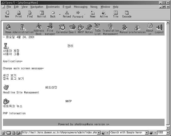 ·Î±×ÀÎÀ» ÇÏ¸é ºê¶ó¿ìÀú À ºÎºÐ¿¡ ¾ÆÀÌÄܵéÀÌ ³ª¿À´Âµ¥ preferences¾ÆÀÌÄÜÀ» ¼±ÅÃÇØ¼ ȯ°æÀ» ¼³Á¤ÇØÁÖ¸é µÈ´Ù. (À§ ȸéÀº ·Î±×ÀÎÇÏ°í ³ª¼ AdministrationÀÇ È¸éÀÌ´Ù.) ¼³Ä¡µÈ À§Ä¡¸¦ À¥ ºê¶ó¿ìÀú¿¡¼ ÁöÁ¤ÇÑ´Ù. ·Î±×ÀÎÇØ º»´Ù. ¿©±â¼ °ü¸®ÀÚ ±ÇÇÑÀ» °¡Áø »õ·Î¿î »ç¿ëÀÚ¸¦ ¸¸µé°í ¿¹Àü °ÍÀº Áö¿ö¹ö¸®´Â °Ô ÁÁ´Ù. (6) Ãß°¡ ¾îÇø®ÄÉÀÌ¼Ç ¼³Ä¡ phpGroupWare À» ¼³Ä¡ÇÏ°í ½ÇÇàÇØ ºÃ´Ù¸é ¾Æ¸¶ Ãß°¡ÀûÀÎ ¾îÇø®ÄÉÀ̼ÇÀ» ¹Þ¾Æ¼ ¼³Ä¡ÇÏ°í ½ÍÀ» °ÍÀÌ´Ù. »õ ¾îÇø®ÄÉÀ̼ÇÀ» ¹ÞÀ¸¸é README³ª INSTALLÀ»