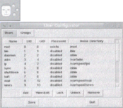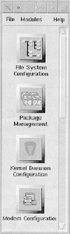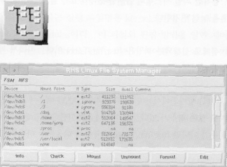 /usr/lib/rhs/contriol-panel 이 디렉토리에는 제어판에 표시할 아이콘 gif 파일과 아이콘과 관련하여 어떤 정의 프로그램을 불러야 하는지 정의하는 파일(*.init)이 들어있다. 권하지는 않지만 제어판에 표시되지 않기를 원하는 구성요소가 있다면 해당 .init파일만 삭제하면 된다. 여러분이 원하고 아이콘과 스크립트 파일을 만들 능력이 된다면 제어판에 등록하는 것도 가능하다. 알짜 레드햇 프로젝트를 진행중인 필자와 알짜팀 또한 이러한 구성요소를 만들고 싶다. 현재 공식적인 레드햇 제어판 에는 다음과 같은 구성요소가 들어있다. 1.파일시스템 제어판