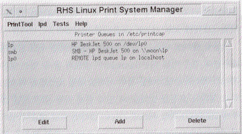 레드햇 4.2 버전부터 추가된 프린터 제어판은 고스트스크립트가 잘 지원하는 프린터에 한하여 고스트 스트립트와 그래픽 관련 유틸리티를 적절하게 결합하여 /etc/printcap을 만들어준 편리한 도구이다. 설정할 수 있는 프린터는 3가지로 서 직접 리눅스 머신에 연결되어 있는 지역 프린터는 물론 삼바 프린터 (smbprint 스트립트 이용), 원격 UNIX 프린터를 지원한다.