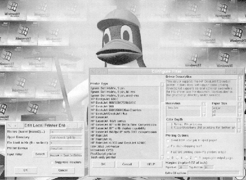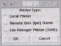 프린터 종류에 따라 설정화면이 매우 많이 달라진다. 지역프린터의 경우에는 고스트 스크립트에서 지원하는 프린터 기종과 여러 옵션 선택화면이 표시되고 원격 UNIX프린터, 또는 SMB 프린터의 경우에는 각각의 위치를 정해주는 간단한 화면이 표시된다. 위 화면은 프린터 설정 전 화면을 캡춰한것이다 영어화면만으로도 부담스럽게 느껴질 수 있을지